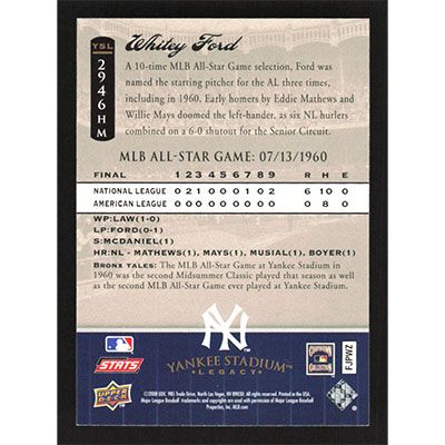 This is a 2008 Upper Deck Yankee Stadium Legacy Collection Historical Moments Whitey Ford baseball card. The card is #2946HM and pictures show condition.