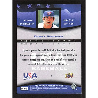 This is a 2008 USA Baseball Danny Espinosa autographed baseball card. This card has been signed, in blue, by Danny Espinosa, and is guaranteed authentic by Ballcardz.com. The card is #4 and pictures show condition.