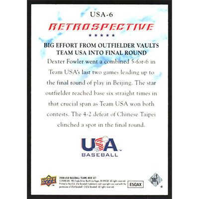 This is a 2008 USA Baseball National Team Retrospective Dexter Fowler autographed baseball card. This card has been signed, in blue, by Dexter Fowler, and is guaranteed authentic by Ballcardz.com. The card is #USA-6 and pictures show condition.