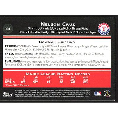 This is a 2009 Bowman Nelson Cruz baseball card. The card is #111 and pictures show condition.