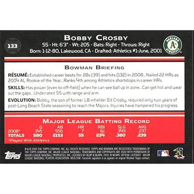This is a 2009 Bowman Bobby Crosby baseball card. The card is #133 and pictures show condition.