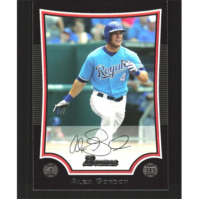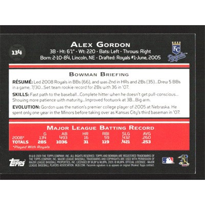 This is a 2009 Bowman Alex Gordon baseball card. The card is #134 and pictures show condition.