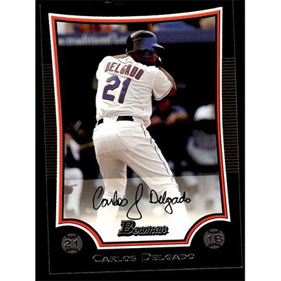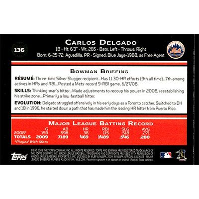 This is a 2009 Bowman Carlos Delgado baseball card. The card is #136 and pictures show condition.