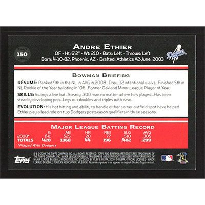 This is a 2009 Bowman Andre Ethier baseball card. The card is #150 and pictures show condition.