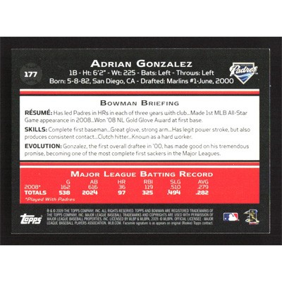 This is a 2009 Bowman Adrian Gonzalez baseball card. The card is #177 and pictures show condition.