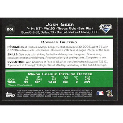 This is a 2009 Bowman Josh Geer baseball card. The card is #201 and pictures show condition.