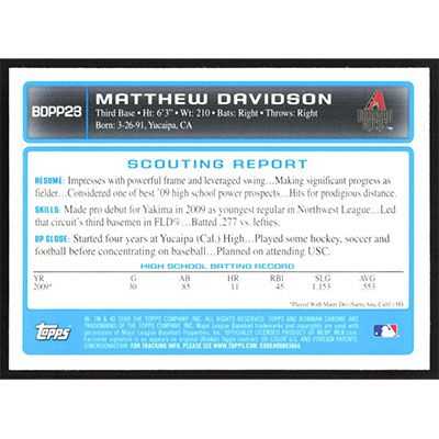 This is a 2009 Bowman Chrome Draft Prospects Matthew Davidson baseball card. The card is #BDPP23 and pictures show condition. Team(s): Arizona Diamondbacks
