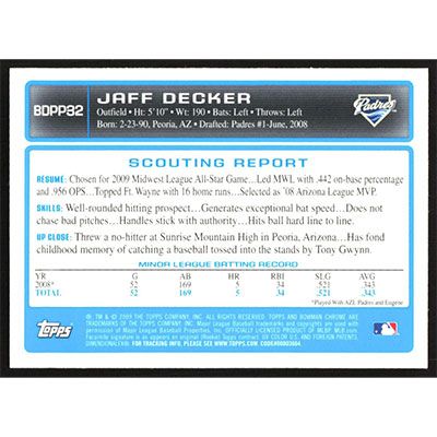 This is a 2009 Bowman Chrome Draft Prospects Jaff Decker autographed baseball card. This card has been signed, in blue, by Jaff Decker, and is guaranteed authentic by Ballcardz.com. The card is #BDPP32 and pictures show condition.