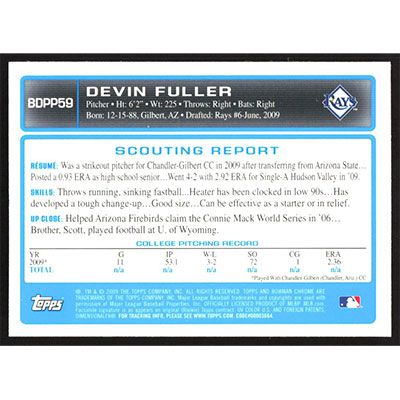 This is a 2009 Bowman Chrome Draft Prospects Devin Fuller baseball card. The card is #BDPP59 and pictures show condition.