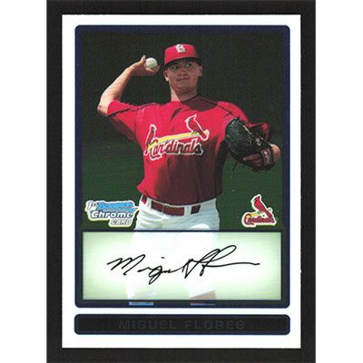 This is a 2009 Bowman Chrome Prospects Miguel Flores baseball card. The card is #BCP73 and pictures show condition.