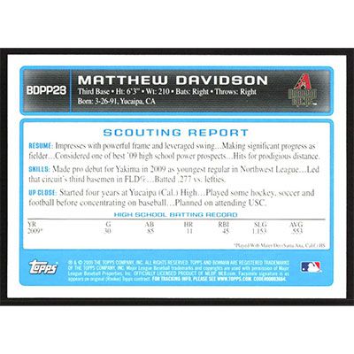 This is a 2009 Bowman Draft Prospects Gold Matthew Davidson baseball card. The card is #BDPP23 and pictures show condition. Team(s): Arizona Diamondbacks