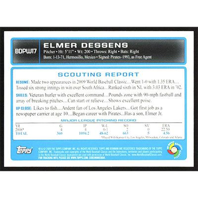 This is a 2009 Bowman Draft WBC Prospects Elmer Dessens baseball card. The card is #BDPW17 and pictures show condition.