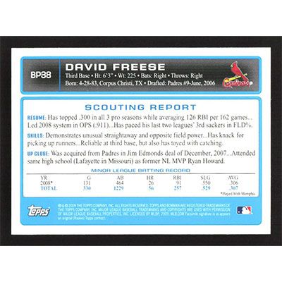 This is a 2009 Bowman Prospects David Freese baseball card. The card is #BP38 and pictures show condition.