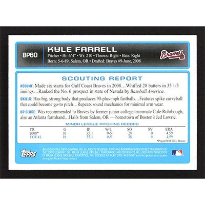 This is a 2009 Bowman Prospects Kyle Farrell baseball card. The card is #BP60 and pictures show condition.