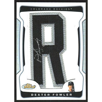 This is a 2009 Finest Refractors Dexter Fowler Jersey Nameplate autographed baseball card. This card has a commemorative jersey letter patch, that has been signed, in silver, by Dexter Fowler, and is certified authentic by Topps. The card is #163 and pictures show condition. This card is limited; #'d 75/75.