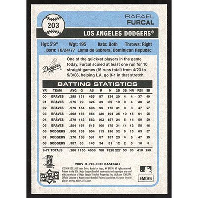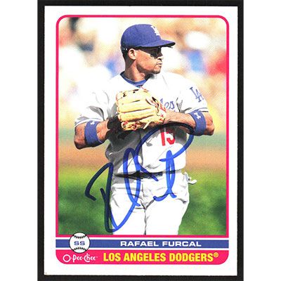 This is a 2009 O-Pee-Chee Rafael Furcal autographed baseball card. This card has been signed, in blue, by Rafael Furcal, and is guaranteed authentic by Ballcardz.com. The card is #203 and pictures show condition.