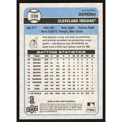 This is a 2009 O-Pee-Chee Mark DeRosa baseball card. The card is #338 and pictures show condition.