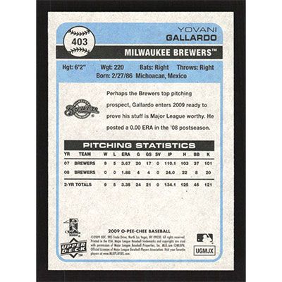 This is a 2009 O-Pee-Chee Yovani Gallardo baseball card. The card is #403 and pictures show condition.