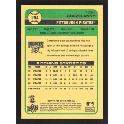 This is a 2009 O-Pee-Chee Black Tom Gorzelanny baseball card. The card is #294 and pictures show condition.