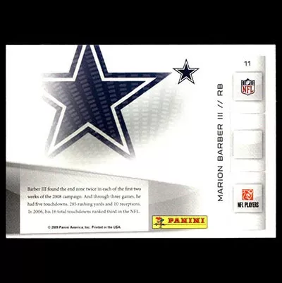 This is a 2009 Playoff Prestige TD Sensations Marion Barber III football card. The card is #11 and is in NM-MT condition.