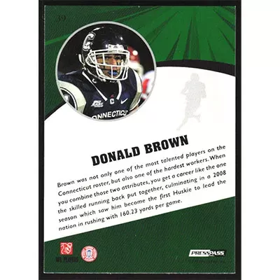 This is a 2009 Press Pass Fusion Donald Brown football card. The card is #39 and pictures show condition.