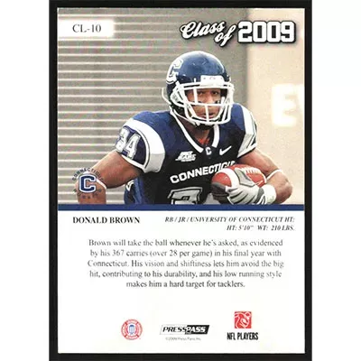 This is a 2009 Press Pass SE Class of 2009 Donald Brown football card. The card is #CL-10 and pictures show condition.