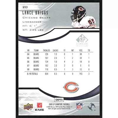 This is a 2009 SP Signature Lance Briggs football card. The card is #20 and pictures show condition.