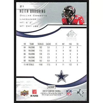 This is a 2009 SP Signature Keith Brooking football card. The card is #21 and pictures show condition.
