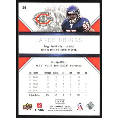 This is a 2009 SP Threads Lance Briggs football card. The card is #59 and pictures show condition.