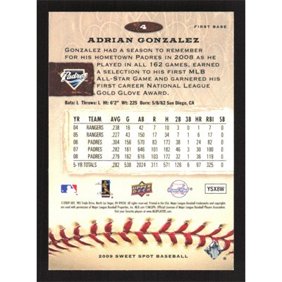 This is a 2009 Sweet Spot Adrian Gonzalez baseball card. The card is #4 and pictures show condition.