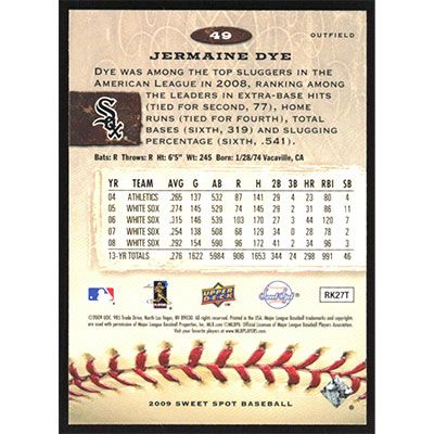 This is a 2009 Sweet Spot Jermaine Dye baseball card. The card is #49 and pictures show condition.