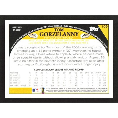 This is a 2009 Topps Tom Gorzelanny baseball card. The card is #109 and pictures show condition.