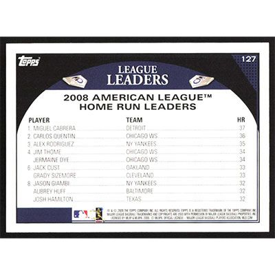 This is a 2009 Topps Miguel Cabrera, Carlos Quentin and Alex Rodriguez League Leaders baseball card. The card is #127 and pictures show condition. Team(s): Detroit Tigers/Chicago White Sox/New York Yankees