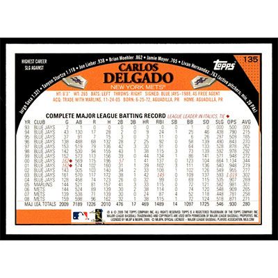This is a 2009 Topps Carlos Delgado baseball card. The card is #135 and pictures show condition.
