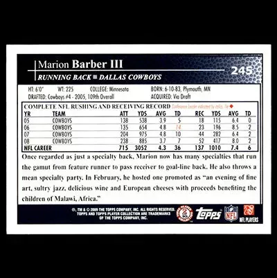 This is a 2009 Topps Marion Barber III football card. The card is #245 and is in NM-MT condition.