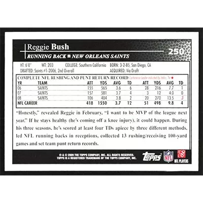 This is a 2009 Topps Reggie Bush football card. The card is #250 and pictures show condition.