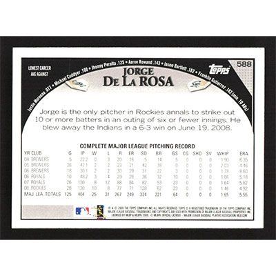 This is a 2009 Topps Jorge De La Rosa baseball card. The card is #588 and pictures show condition.
