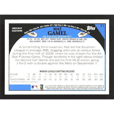 This is a 2009 Topps Mat Gamel baseball card. The card is #71 and pictures show condition.
