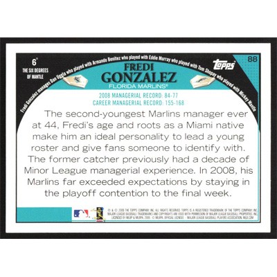 This is a 2009 Topps Fredi Gonzalez autographed baseball card. This card has been signed, in blue, by Fredi Gonzalez, and is guaranteed authentic by Ballcardz.com. The card is #88 and pictures show condition.