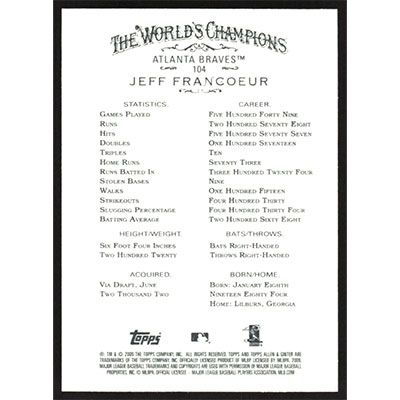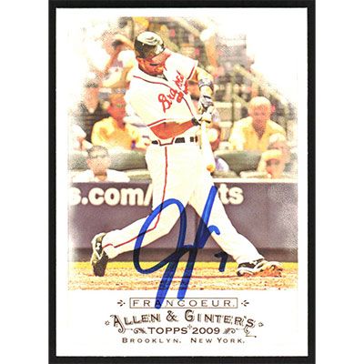 This is a 2009 Topps Allen & Ginter Jeff Francoeur autographed baseball card. This card has been signed, in blue, by Jeff Francoeur, and is guaranteed authentic by Ballcardz.com. The card is #104 and pictures show condition.