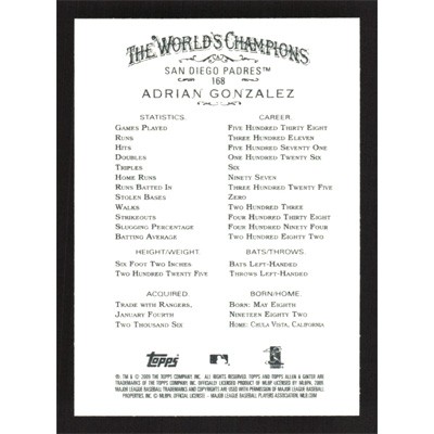 This is a 2009 Topps Allen & Ginter Adrian Gonzalez baseball card. The card is #168 and pictures show condition.