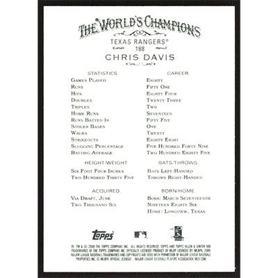 This is a 2009 Topps Allen & Ginter Chris Davis baseball card. The card is #188 and pictures show condition.