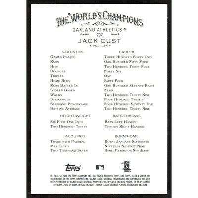 This is a 2009 Topps Allen & Ginter Jack Cust baseball card. The card is #207 and pictures show condition.