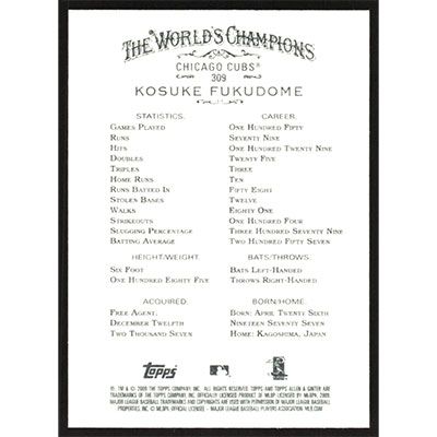 This is a 2009 Topps Allen & Ginter Kosuke Fukudome short print baseball card. The card is #309 and pictures show condition.