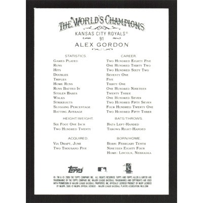 This is a 2009 Topps Allen & Ginter Alex Gordon autographed baseball card. This card has been signed, in blue, by Alex Gordon, and is guaranteed authentic by Ballcardz.com. The card is #91 and pictures show condition.