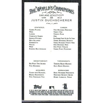 This is a 2009 Topps Allen & Ginter Mini Justin Duchscherer short print baseball card. The card is #335 and pictures show condition. Team(s): Oakland Athletics
