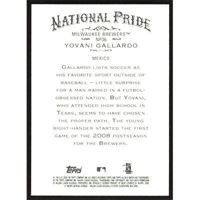 This is a 2009 Topps Allen & Ginter National Pride Yovani Gallardo baseball card. The card is #NP36 and pictures show condition. Team(s): Milwaukee Brewers