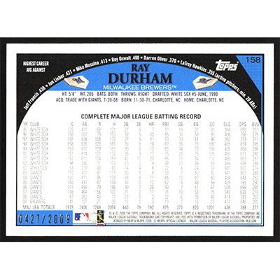 This is a 2009 Topps Gold Ray Durham baseball card. The card is #158 and pictures show condition. This card is limited; #'d 0427/2009. Team(s): Milwaukee Brewers