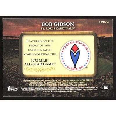 This is a 2009 Topps Legends Commemorative Patch Bob Gibson 1972 All-Star Game baseball card. The card is #LPR-36 and pictures show condition. Team(s): St. Louis Cardinals