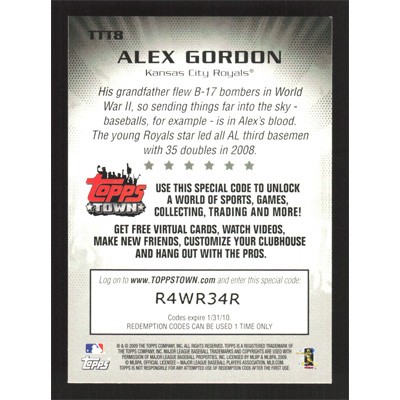 This is a 2009 Topps Topps Town Alex Gordon baseball card. The card is #TTT8 and pictures show condition.
